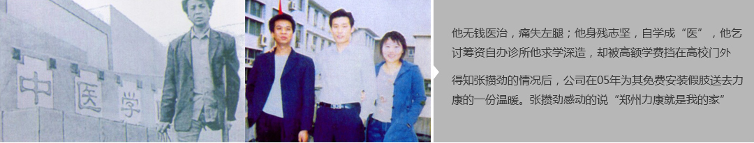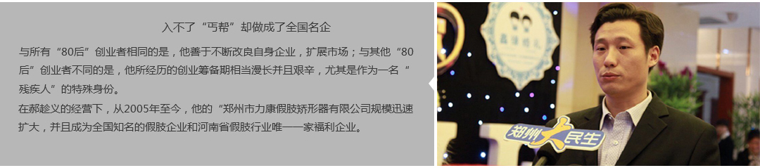 鄭州市力康假肢矯形器有限公司(簡(jiǎn)稱力康),是一家專(zhuān)業(yè)從事假肢矯形器的設(shè)計(jì)、研發(fā)、制作及裝 配的專(zhuān)業(yè)機(jī)構(gòu)。成立于1992年是河南省唯一一家福利企業(yè)。力康下設(shè)業(yè)務(wù)部、技術(shù)部、住院部、康復(fù) 部、售后服務(wù)部,并配有現(xiàn)代化的裝配車(chē)間和功能齊全的訓(xùn)練大廳,為殘疾朋友康復(fù)訓(xùn)練提供了可靠 保障。總經(jīng)理穿戴假肢多年,有著豐富的臨床經(jīng)驗(yàn)和親身體會(huì);多年來(lái),力康已為全國(guó)幾十萬(wàn)名殘疾 朋友安裝上舒適、美觀、耐用的假肢和矯形器具,使他們更大限度地恢復(fù)了正常的工作和生活。“產(chǎn) 品即人品”的質(zhì)量理念、先進(jìn)的技術(shù)、實(shí)惠的價(jià)格、完善的售后服務(wù)是力康取勝的法寶……